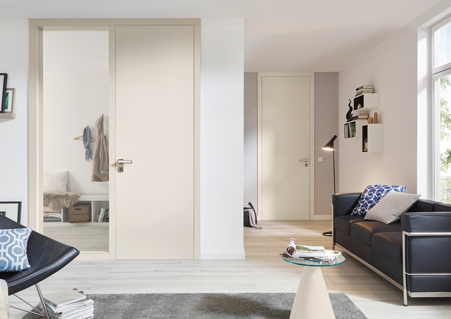Farbton Weiß verdeutlicht, wie harmonisch eine Tür mit Angora matt CPL im Wohnraum wirkt. Das klassische Weiß schafft